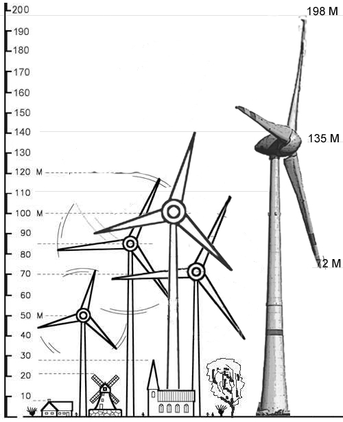 The largest wind turbine now is the Enercon E-126 (198 metres high) and rotor diameter of 126 metres. It's rated output is 6-7 MW, shown in the diagram below (see ref 9 for a description of the construction of a 5MW machine).