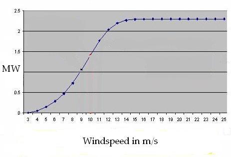 Output curve for a typical 2.5 MW wind turbine. Note that "full" output is only reached when the wind speed is 15m/s (34 miles per hour or Beaufort Force 7)