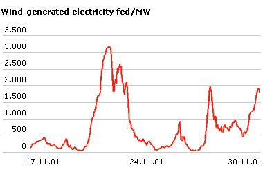 "The force of the wind generally fluctuates considerably within the space of a few days and even a few hours. Sometimes the wind can drop just when the demand for electricity is at its peak. The graph, which documents the amount of electricity generated during the month of November in 2001, illustrates this point well.
